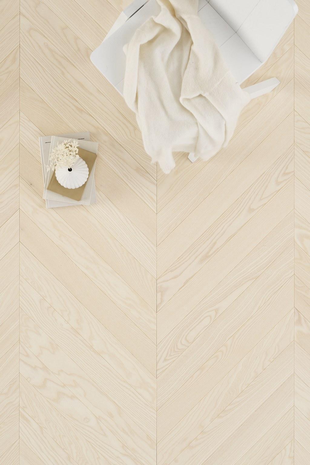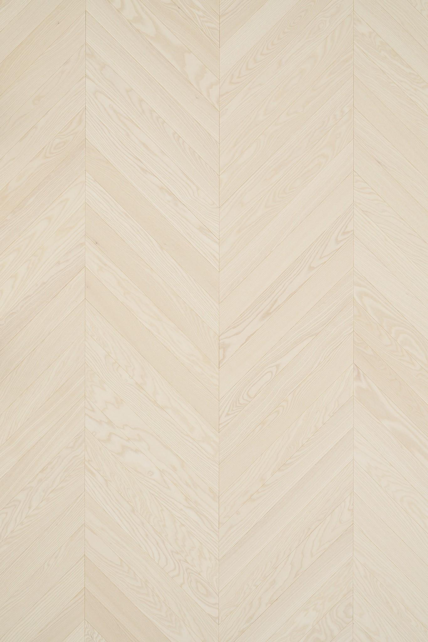 Timberwise Designparketti Chevron Select vaalea. Chevron on ranskalainen versio kalanruotokuviosta, jossa parkettilaudat ovat 45 asteen kulmassa sekä vasemmalle, että oikealle muodostaen V-kuvion. Perinteisessä kalanruodossa laudan päät ovat suorat, kun taas Chevronissa ne ovat kulmassa.