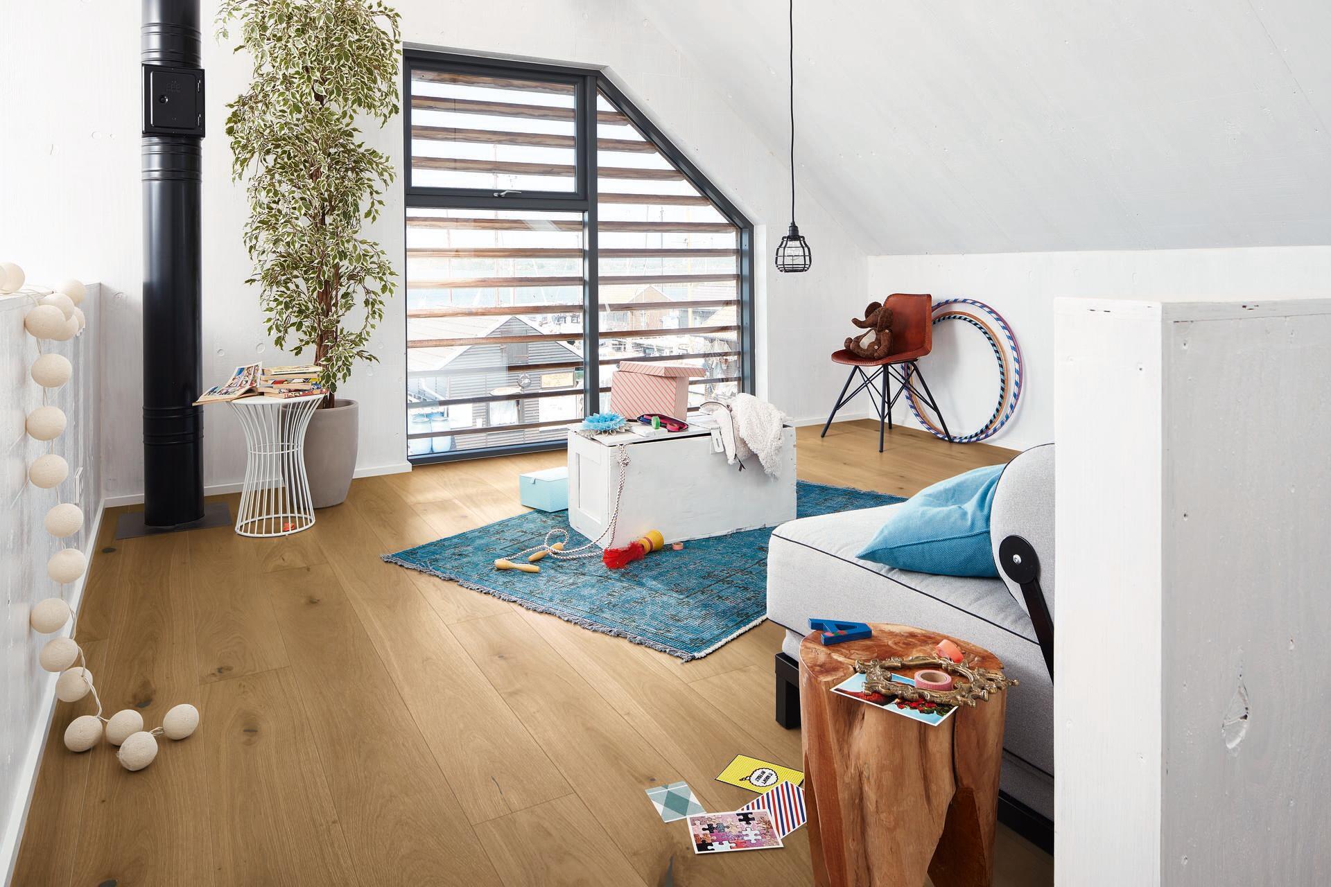 Greige-sävy on yksi tämän hetken suosituimmista sisustusväreistä. Se yhdistää beigen kodikkuuden ja harmaan modernin selkeyden, mikä tekee lattiasta monipuolisen pohjan erilaisille sisustustyyleille. 1-sauvaiset lankut korostavat tammen luonnollista kuviota ja luovat yhtenäisen, avaran ilmeen huoneeseen.