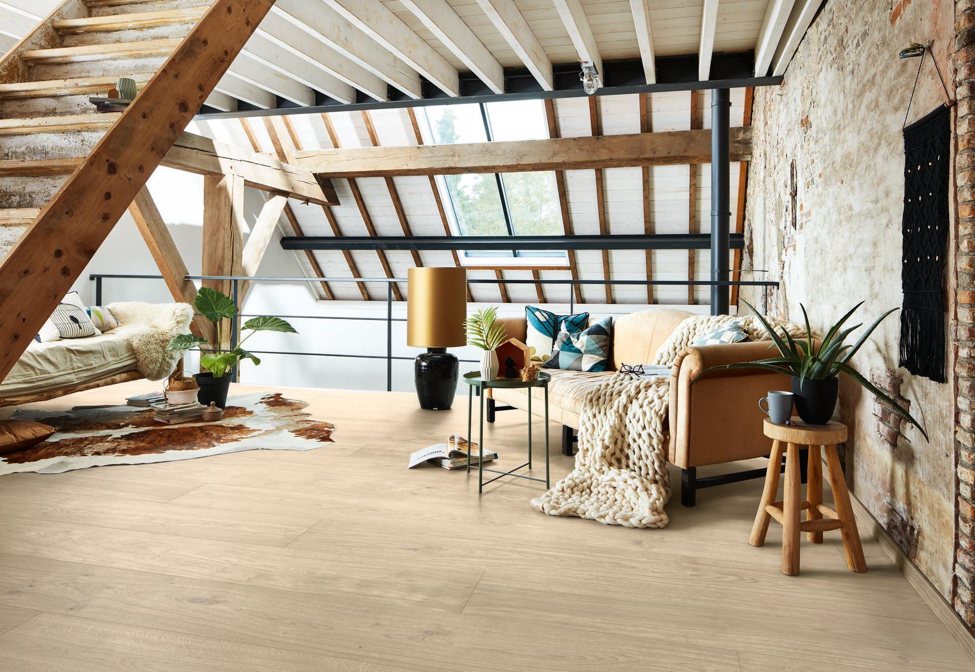 Meister PD 450 Authentic Limed White Oak 09003 on 1-sauvainen leveä lankkuparketti, jonka valkokuultava tammen sävy ja eläväinen Authentic-lajitelma tekevät siitä valoisan ja ajattoman lattiaratkaisun.